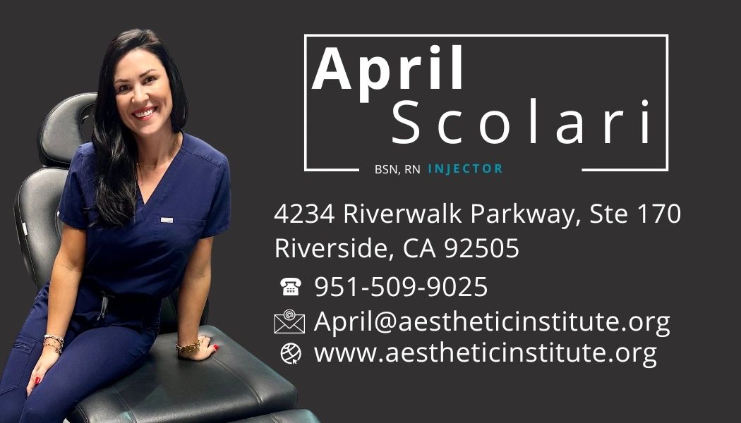 Aesthetic Institute by April Scolari 4234 Riverwalk Parkway, Suite 150 or 170 Riverside, CA 92505 951-509-9025 (office) 951-427-8815 (direct to April)